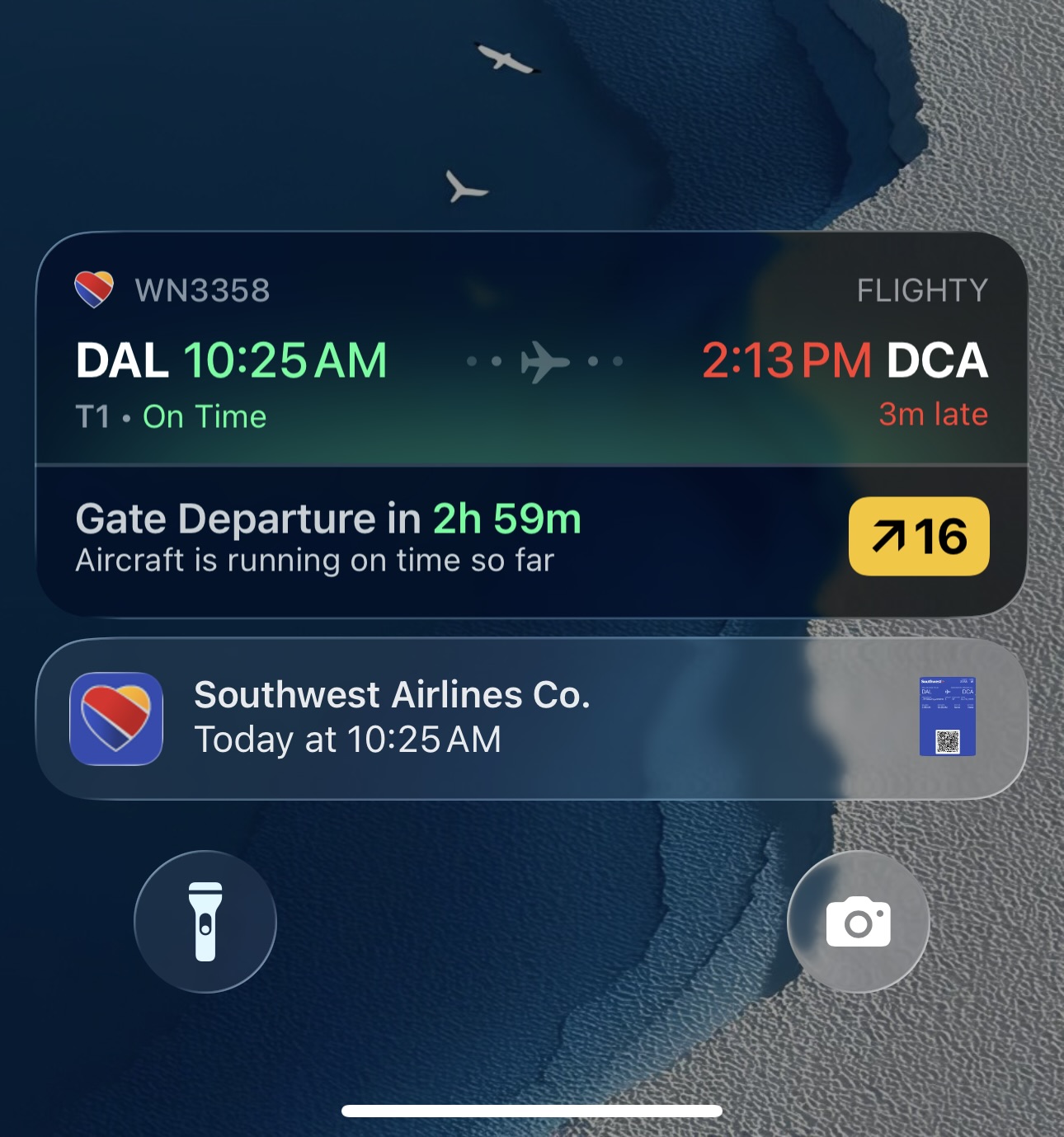 The day of my flight, Flighty sent me a notification saying “Good morning,” followed by my departure time and whether or not I had any delays. For the rest of the day until my flight landed in the afternoon, I had a live activity pinned to my homescreen with my departure and arrival time, as well as gate and terminal number.
